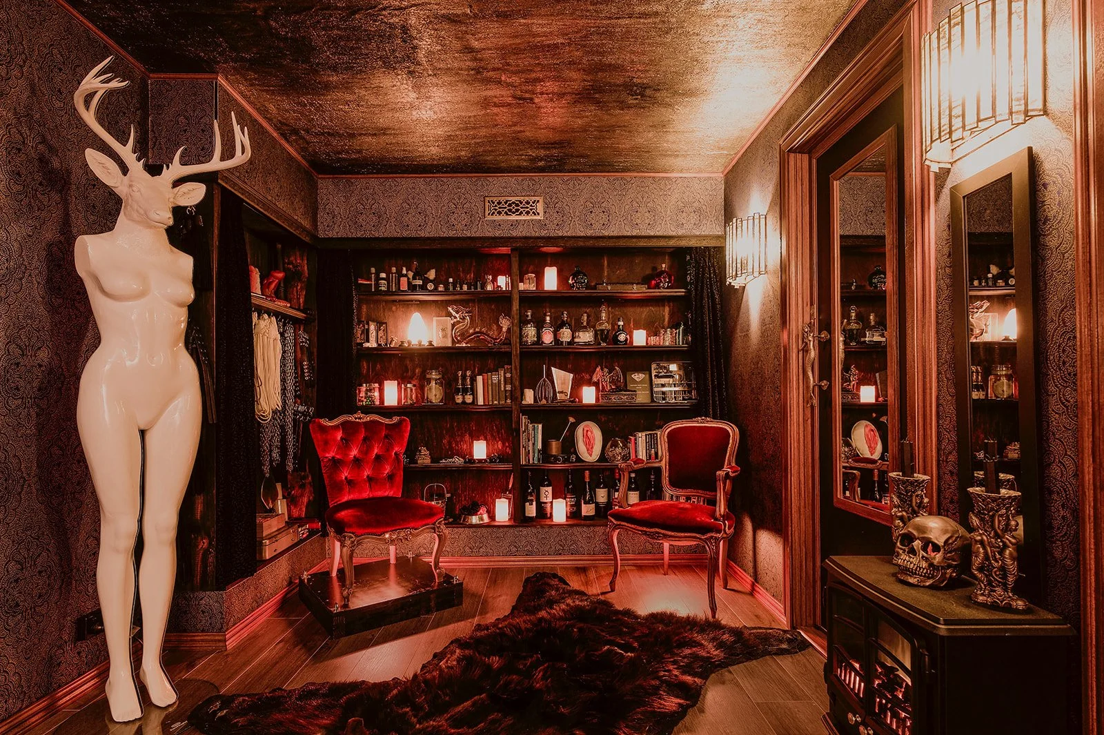Textures beckon. Wood, fabric, and metal. A velvet throne awaits you. Toys and tools of the trade decorate every corner. This is not a place for faking it, but for permission to be yourself. To explore. To feel. To be seen.